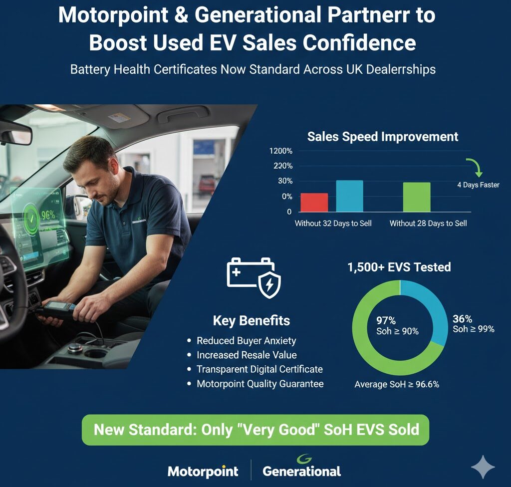 英国最大の独立系中古車ディーラーであるモーターポイントは、中古EVの購入検討者が抱く「バッテリー劣化」への不安を解消するため、ジェネレーショナル(Generational)社と提携し、バッテリー健全性テストを全21店舗および2つの車両準備センターで本格導入しました。